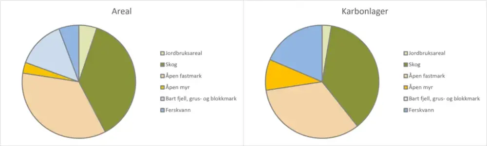 Våtmarkssystem lagrar særleg mykje karbon, til trass for at dei ikkje dekkar så store areal. Bart fjell manglar både vegetasjon og jordsmonn og lagrar ikkje karbon i det heile. Der det finnast vegetasjon og jordsmonn, som i skogen, lyngheia, grasmarka og myra ligg det lagra mellom 10 og 60 kg karbon per kvadratmeter.