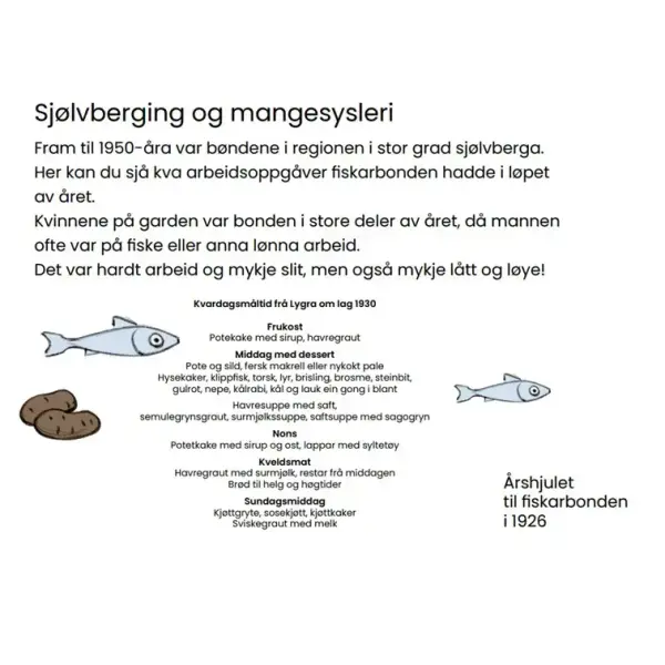 Fisk på kvardagar (sild, fersk makrell, nykokt pale (småsei), hysekaker, klippfisk, torsk, lyr, brisling, brosme eller steinbit).