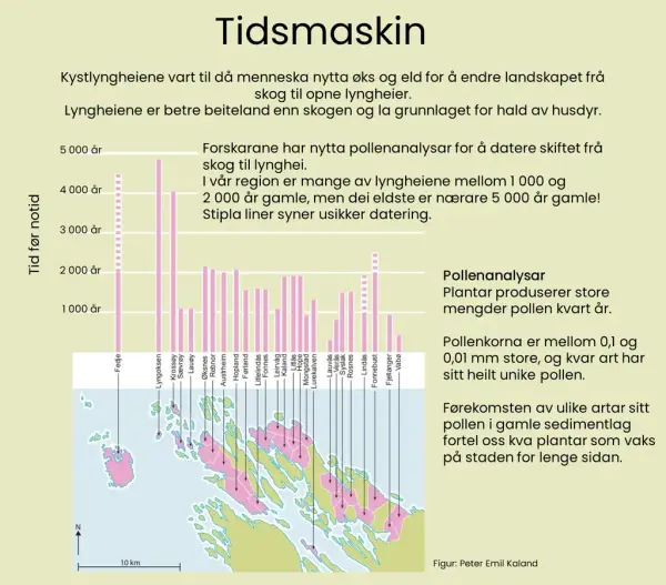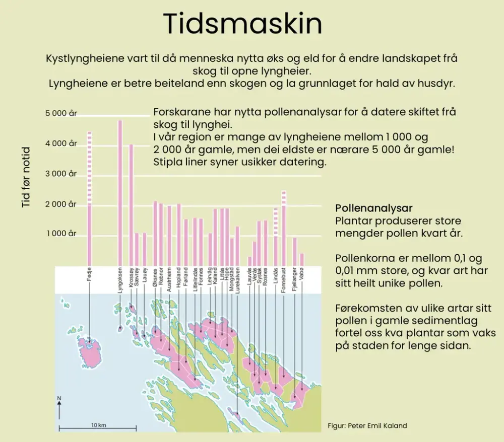 På denne måten kan ein få viktig kunnskap om menneska som har vore her før oss, utan å vere avhengig av skriftlege kjelder. Pollenanalyser frå kysten av Nordhordland syner stor variasjon i når menneska har opna landskapet frå skog til lynghei. Dei eldste lyngheiene i vår region er nesten 5 000 år gamle, medan dei fleste er langt yngre: 1 000 - 2 000 år gamle. Dei eldste lyngheiene ligg ytst langs kysten, for det var sjøen som transportåra heilt fram til moderne tid. Etterkvart som det vart fleire menneske tok ein meir av landet i bruk.