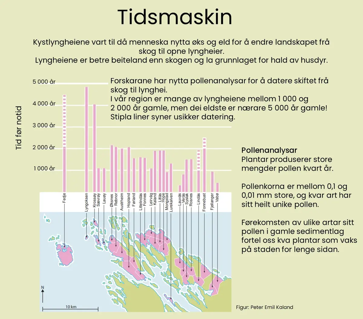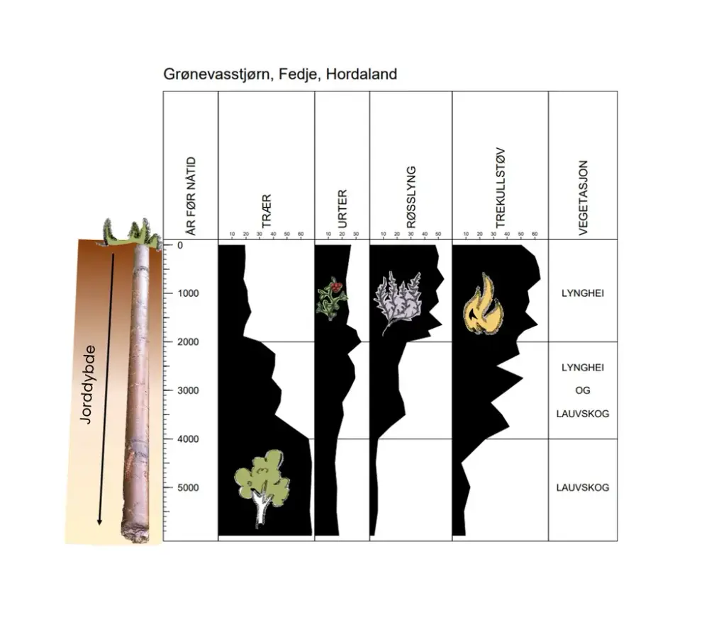 Pollendiagramet over er frå Grønevasstjørn på Fedje. Dei svarte felta presenterer pollenmengder. Her kan ein sjå at det var lauvskog i området fram til om lag 4 000 år sidan. Etter dette vert det gradvis mindre trepollen i prøvane, samstundes som pollen frå gras og lyng aukar. I tillegg til pollen finn forskarane også mykje kolstøv i prøvane parallellt med at mengda trepollen vert redusert. Til saman fortel dette ei viktig historie om landskap og levevis. Menneska som levde her for om lag 4 000 år sidan opna opp det skogkledde landskapet for å fremme lyngheier som er gode beiter for husdyr. Eld var eit viktig reiskap som hjalp til med å fjerne stubbar, busker og kratt, og gav friskt gras og lyng i staden.