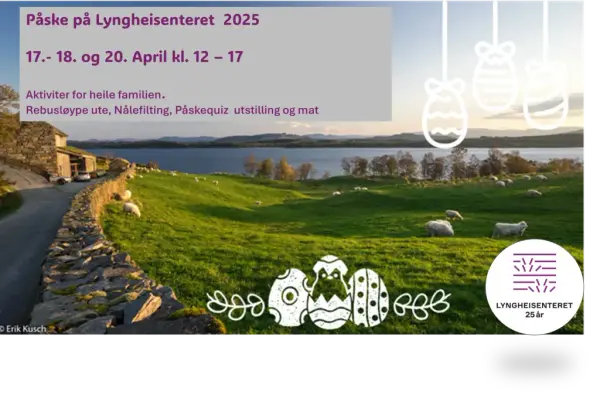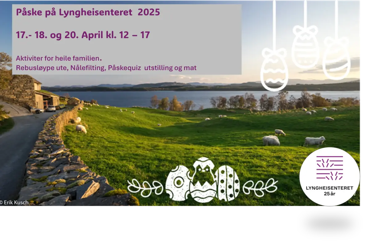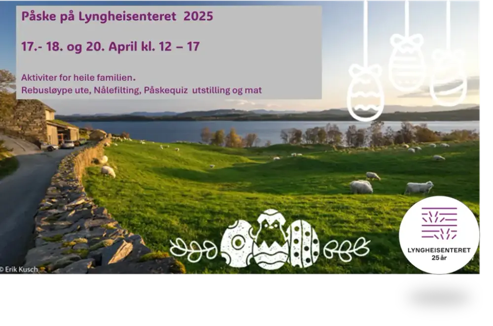 Det vert påskeaktivitetet for små og store - inne og ute. Rebusløype, Påskeverkstad med nålefilting. Påskequiz med premier. Leikekrok. Tilrettelagde turløyper i det opne landskapet. Hesteskokasting, gå på stylter og styrketest.