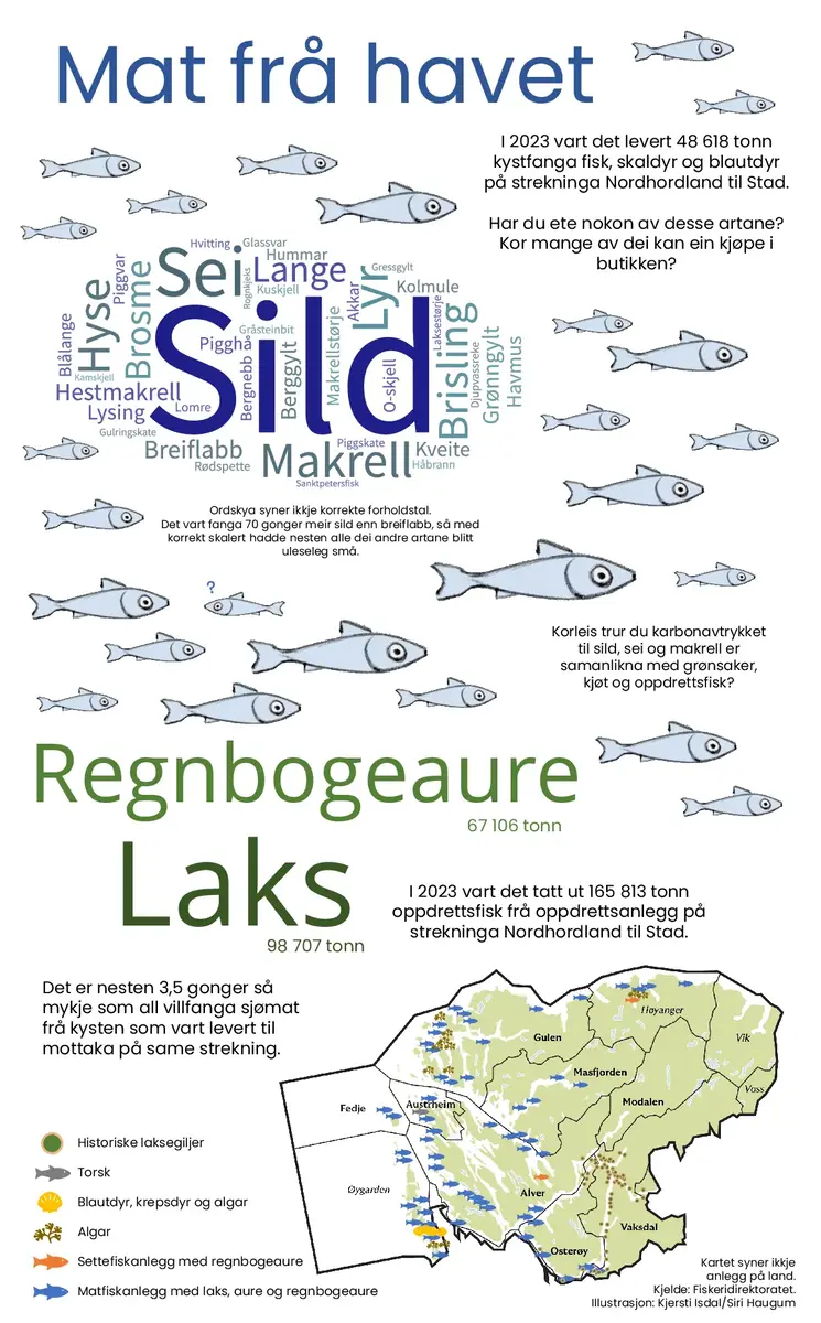 I 2023 vart det tatt ut 165 813 tonn oppdrettsfisk frå oppdrettsanlegg på streklninga Norhordland til Stad. Det er nesten 3,5 gonger så mykje som all villfanga sjømat frå kysten som vart levert til mottaka på samme strekning.