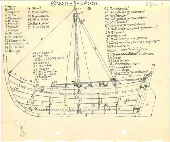 "Brørvikskuto" frå 1863. Skisse med namn på dei ulike delane, utforma av Hans Mathiasson Brørvik (1858-1941) og Johannes Leiro (1885-1963). Teikninga manglar dei rette proporsjonane.