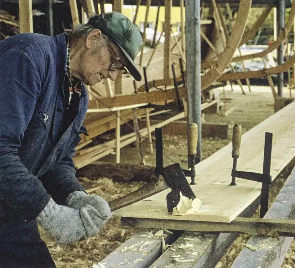 Hans Brørvik (1920-2008) i arbeid med skuta. Foto: Arne Høyland/Norsk håndverksinstitutt. - 2/2