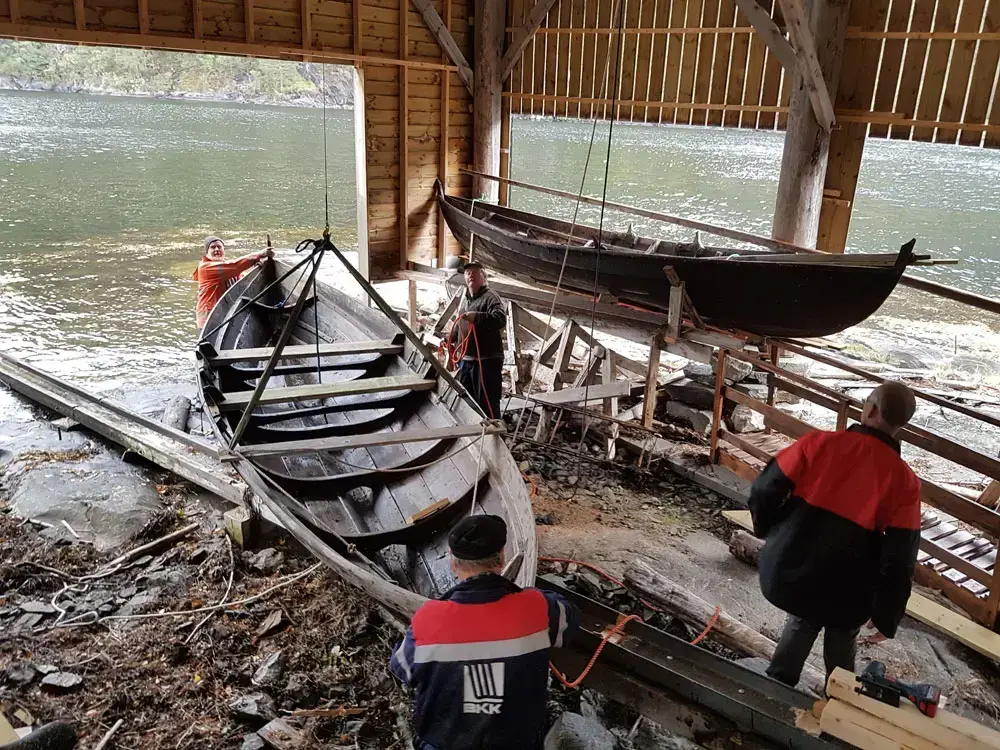 Seksæringen frå Veafjorden vert heist opp for å lagrast på loftet i Skutenaustet. I bakgrunnen ser me ein færing frå Bolstadfjorden. Foto: Oddvar A. Bukkestein.