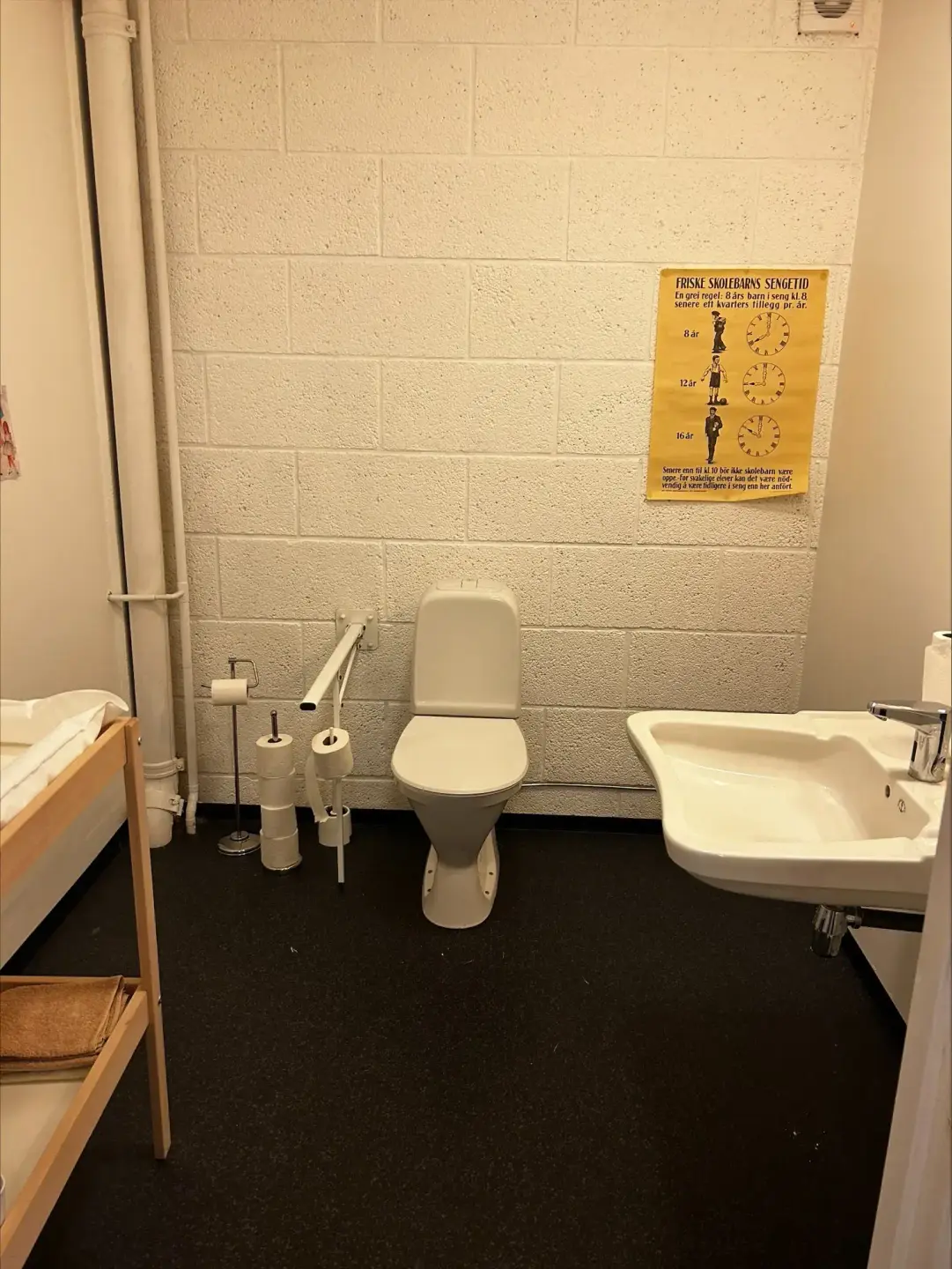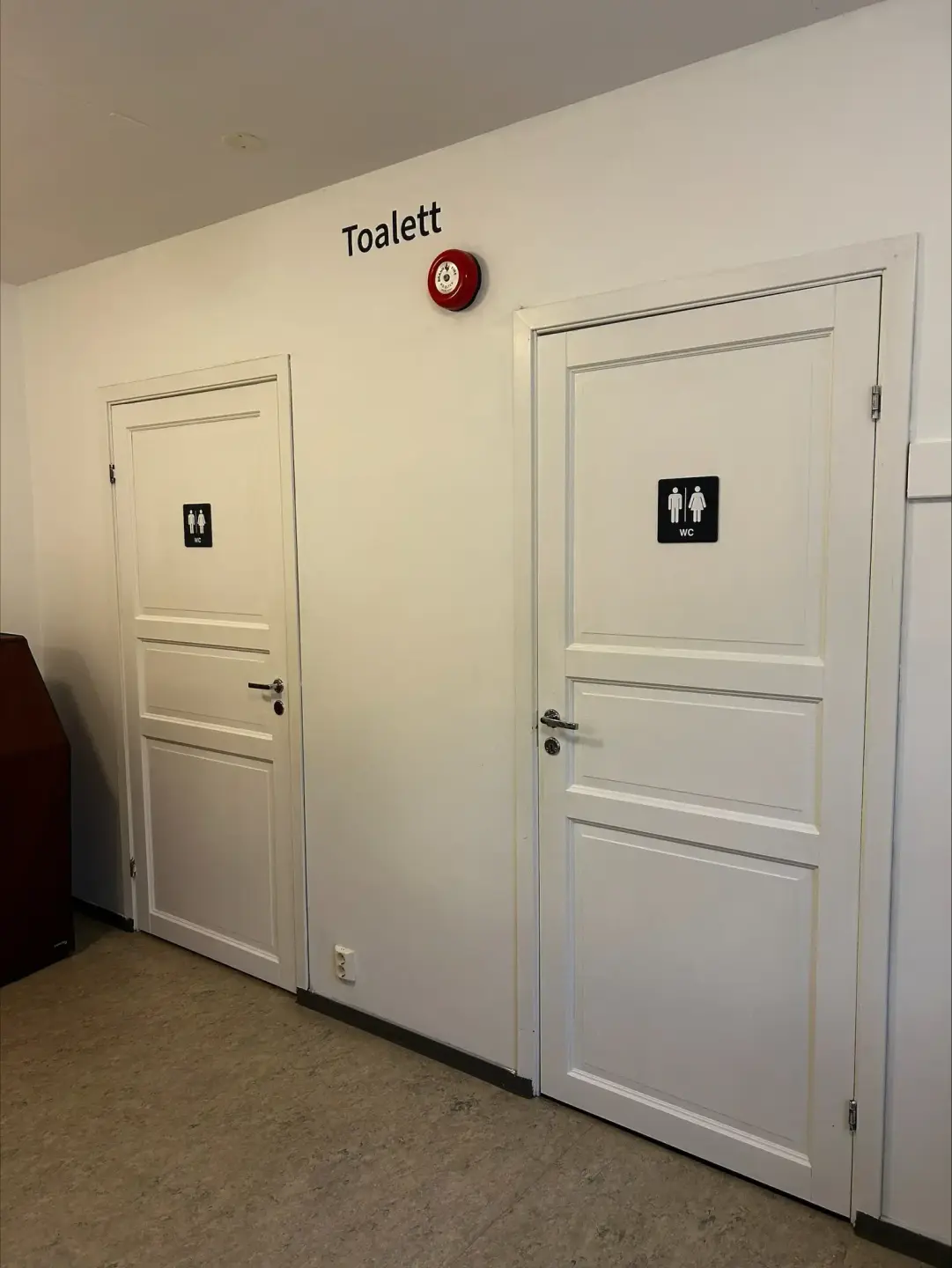 Det er to toalett rett bak butikken i hovudbygget. Dørene inn til toalettet er 87,5 cm breie. På eit av toalettene er det handlene på høgre side som kan tas opp og ned.
