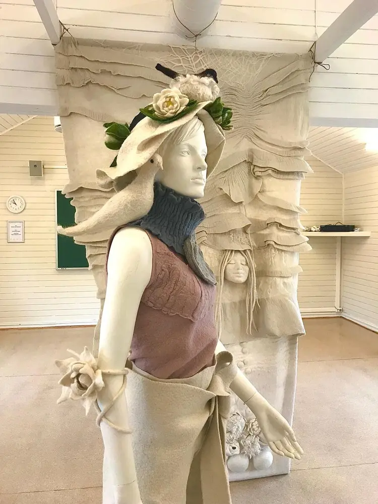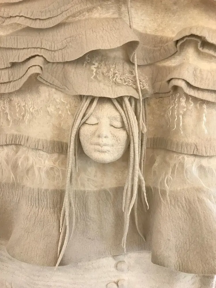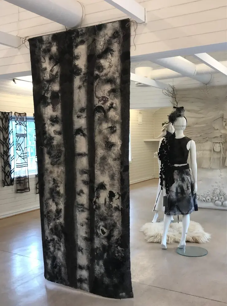 "I utställningen AV DEN VITA ULLEN har jag begränsat mig till att bara använda vit ull i mitt filtmakande av den svenska ullen.