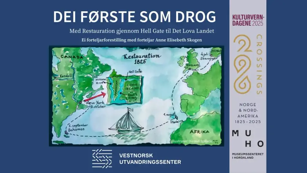 Gjennom denne forteljinga blir tilhøyrarane teke med tilbake til sommaren 1825. Ved Bispebrygga i Stavanger låg seglskuta Restauration fortøyd. Om bord på dekk sto eit følgje på over femti menneske, barn, ungdomar og vaksne. Dei var reiseklare, klare til å vinka eit siste farvel til slekt og venner. Og dei skulle langt, over sjølve Atlanterhavet til Amerika.