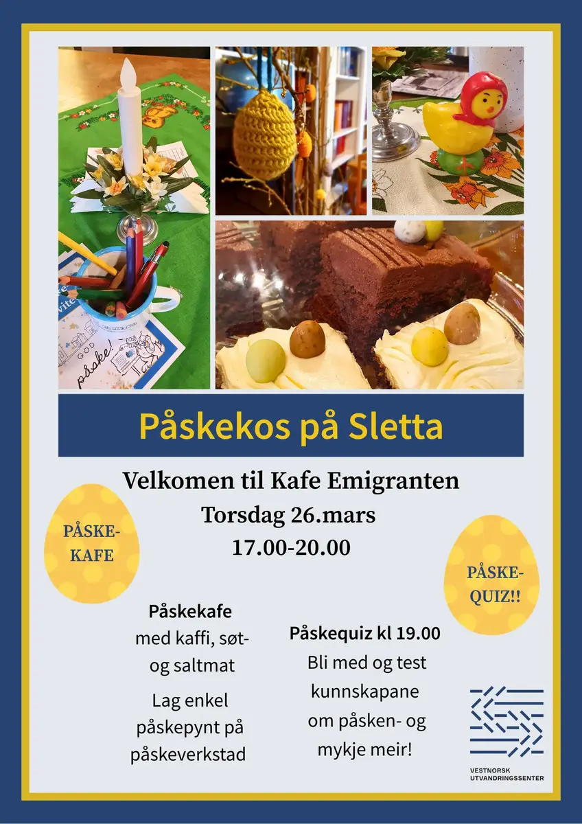Kom gjerne fleire generasjonar til kafe, samvær og påskeverkstad i Kafe Emigranten.Det blir påskekafe med kaffi, salt- og søtmat. Vi leitar fram litt om påsketradisjonar, og det blir mogleg å lage enkel påskepynt av ymse slag.