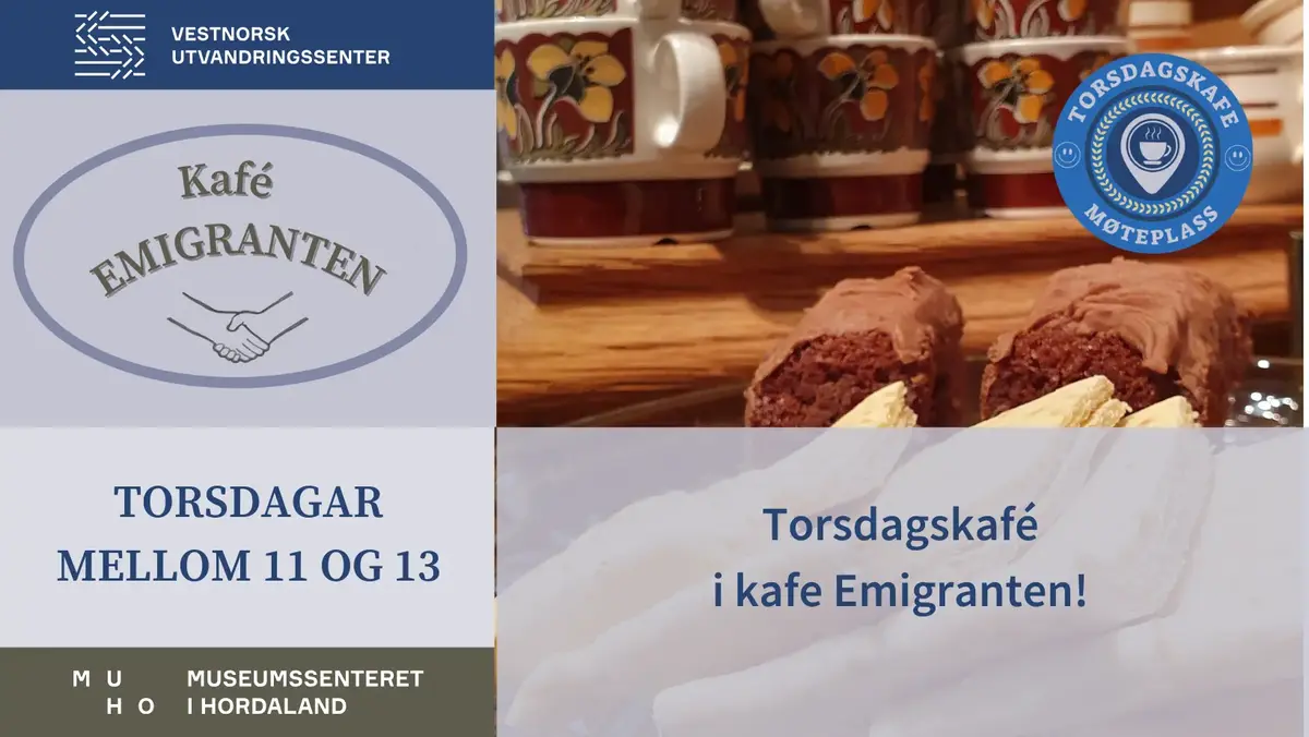 Emigranten er kaféen vår på Vestnorsk utvandringssenter. Her har det alltid vore møteplass og samlingsplass. Vi har innreda dette sosiale rommet til en koseleg kafé. Her har vi lagt til rette for at folk skal møtast, prate og ha det fint. Mange er heime på dagtid og vi ønsker alle velkommen.